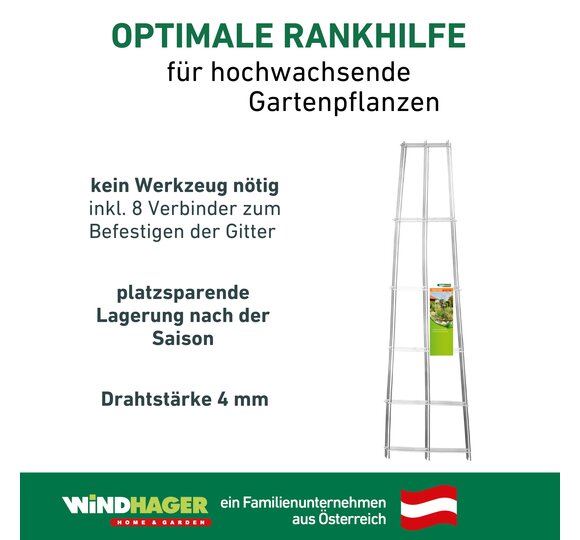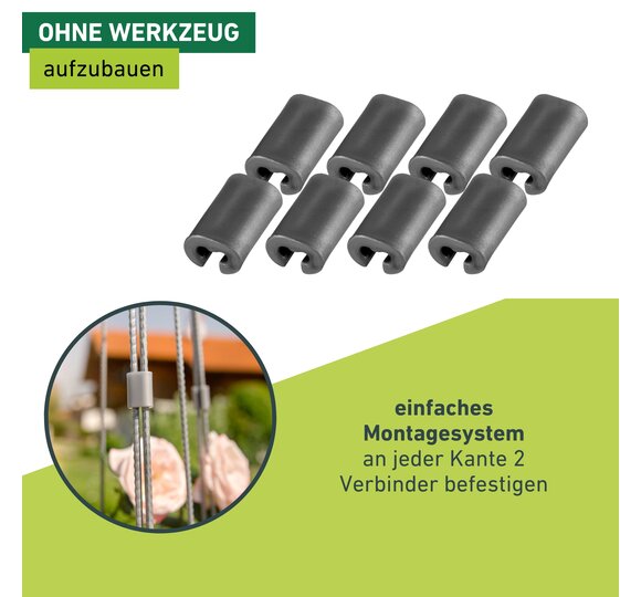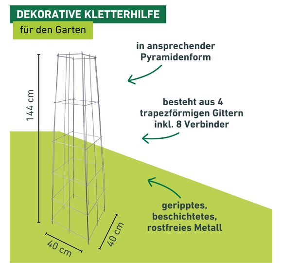 Dank des einfachen Monatagesystems wird sie ohne Werkzeug aufgebaut, lediglich 2 Verbinder pro Kante sind anzuklipsen. Schon ist der Rankturm einsetzbar und verhilft einer Vielzahl an prächtigen Pflanzen wie Efeu, Rosen, Clematis oder Gemüse zu optimalem Wachstum.