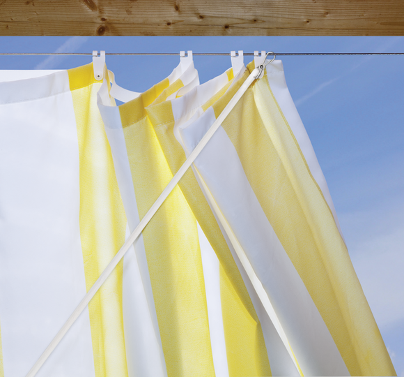 Die Befestigungsösen für den Stab werden am Stoff angeklippt und können so schnell und einfach bewegt werden.