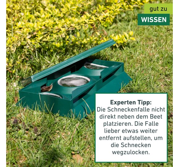 Hinweis: Da Schnecken von dem Geruch des Biers angezogen werden, sollte die Falle nicht direkt am Beet platziert werden. Wenn Sie die Bierfalle etwas entfernt aufstellen, werden die Schnecken vom Beet weggelockt. Gleichzeitig wird verhindert, dass Schnecken durch den Geruch des Biers vermehrt in die Richtung Ihres Beetes kriechen.