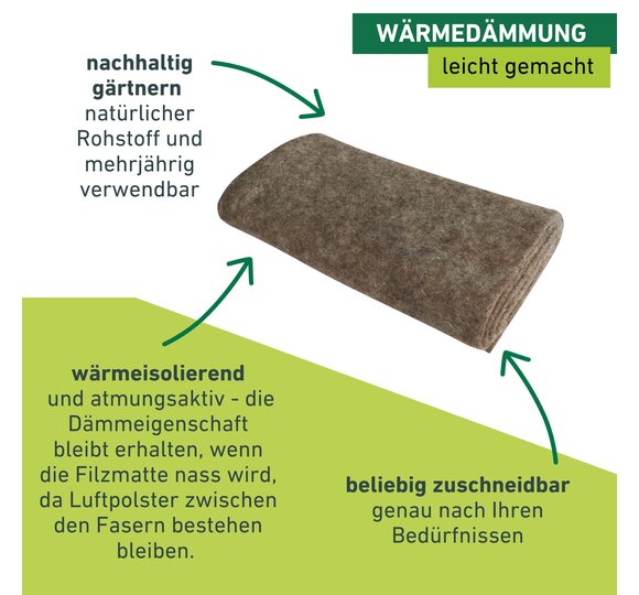 Damit Ihre Topfpflanzen die kalten Temperaturen im Winter gut überstehen, müssen sie richtig geschützt werden. Diese Öko-Filzmatte aus reiner Schafwolle wird um den Topf der Pflanzen gewickelt und mindert auf diese Weise die Gefahr des Durchfrierens des Wurzelballens. Durch ihre wärmeisolierende Funktion sorgt die Schafwolle auf natürliche Weise dafür, dass Ihre Topfpflanzen gut durch den Winter kommen. Selbst wenn die Schafwolle nass wird, bleibt die Wirkung erhalten. Diese natürliche Art des Winterschutzes ist nicht nur effektiv, sondern zeichnet sich zudem durch ihre Nachhaltigkeit aus.