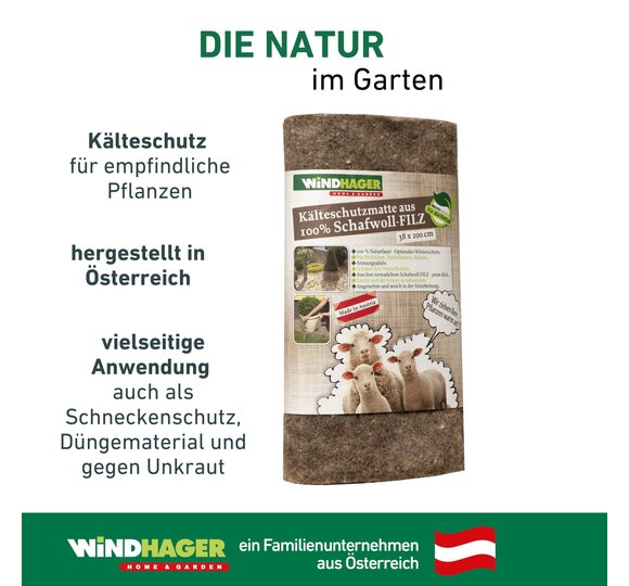 Alle aus Schafwolle gefertigten Produkte von Windhager werden in Österreich hergestellt und bestehen aus 100% Schafwolle. Dabei handelt es sich um einen nachhaltigen Rohstoff, welcher sich im Garten mehrjährig verwenden lässt. Durch ihre wärmeisolierende und atmungsaktive Eigenschaft ist sie der ideale, natürliche Winterschutz für Pflanzen im Garten.