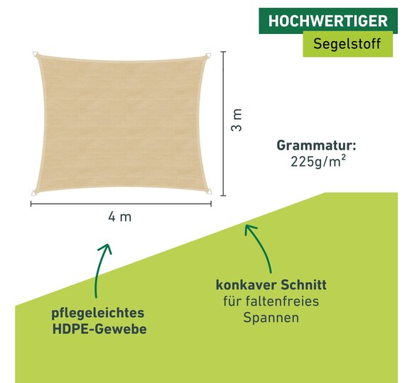 - TOP MATERIAL - Hochwertiges HDPE-Gewebe (225g/m²) mit Metallösen und verstärkten Säumen, die für festen Halt sorgen und das Segel reißfest machen.