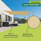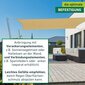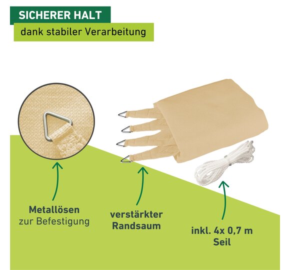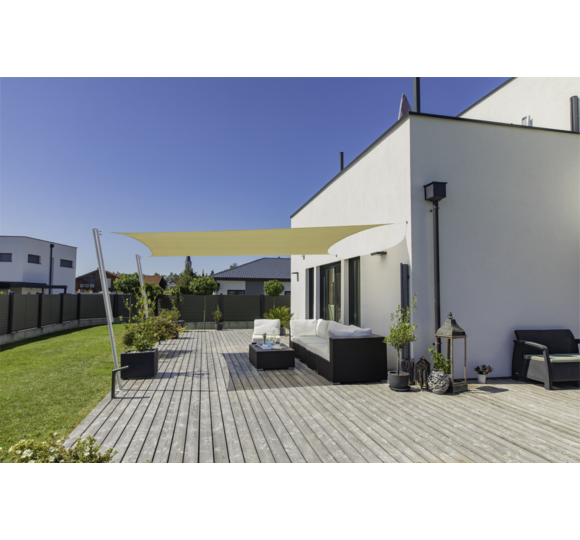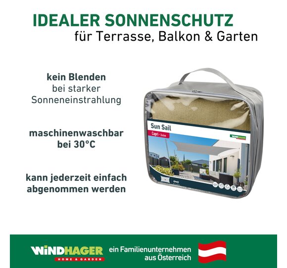 Das pflegeleichte HDPE-Gewebe des Sonnensegels CAPRI lässt sich einfach reinigen – entweder bei 30° in der Waschmaschine oder mit milder Seifenlauge. Diese wind- und wasserdurchlässige Ausführung hat den Vorteil, dass es unter dem Sonnensegel angenehm kühl bleibt, weil kein Hitzestau entsteht. Dazu fängt das Sonnensegel 90% der UV-Strahlen ab, lässt aber die angenehme frische Brise durch. Die verstärkten Säume sind bei einem Sonnensegel besonders wichtig, denn sie sorgen für einen festen Halt – und dafür, dass die Seiten auch bei Wind nicht reißen.