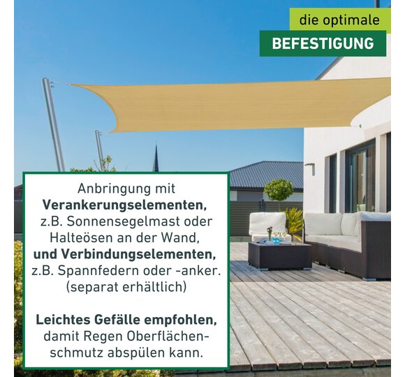 Die Anbringungsmöglicheiten der Sonnensegel sind so vielfältig wie die Gärten und Terrassen, auf denen sie Schatten spenden. Grundvoraussetzung ist immer, dass das Sonnensegel an allen Ecken verankert wird. Dazu dienen Verankerungselemente wie z. B. Sonnensegelmast, Halteöse an der Wand, Ösenschraube für Pfosten u. Ä. Mit Hilfe von Verbindungselementen (Seil, D-Schäkel, Karabiner, Spannanker, Expanderseil, Spannfeder) wird das Sonnensegel in das Verankerungselement eingehängt.
