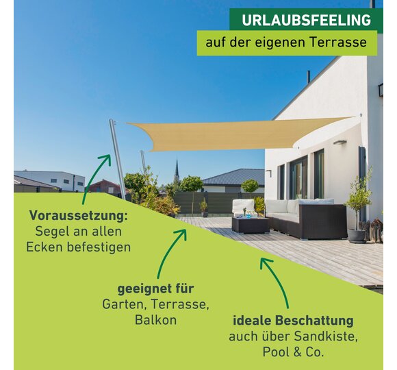 Sonnensegel eignen sich nicht nur für Terrassen, auch am Balkon, auf der Wiese, über dem Pool oder der Sandkiste lässt sich so ein tolles Sonnendach zaubern. Einzige Voraussetzung: das Segel muss an 4 Punkten befestigt werden können.