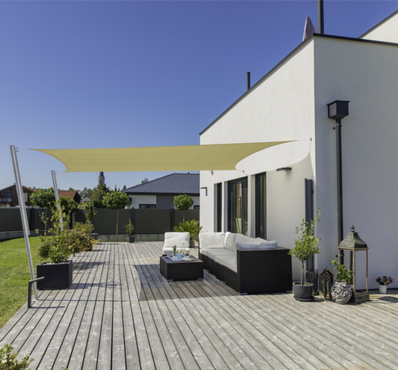 2. Größe und Form des Sonnensegels sollten den Bereich gut abdecken – hierfür gibt es verschiedene Größen und Formen: dreieckig, quadratisch oder rechteckig.