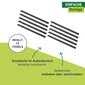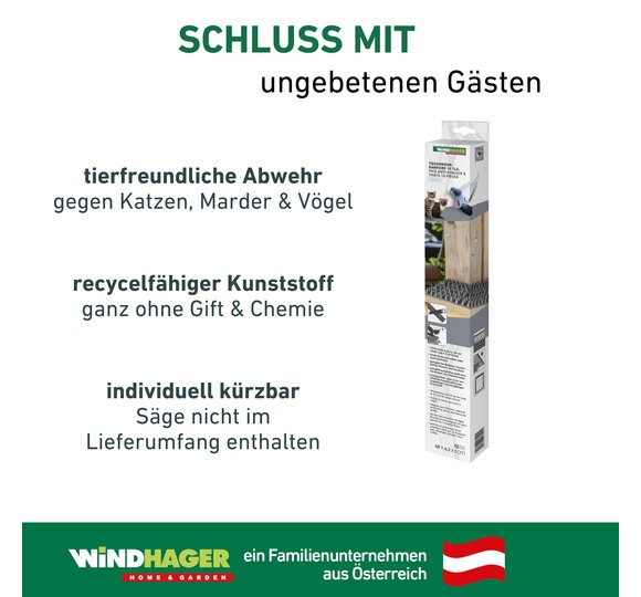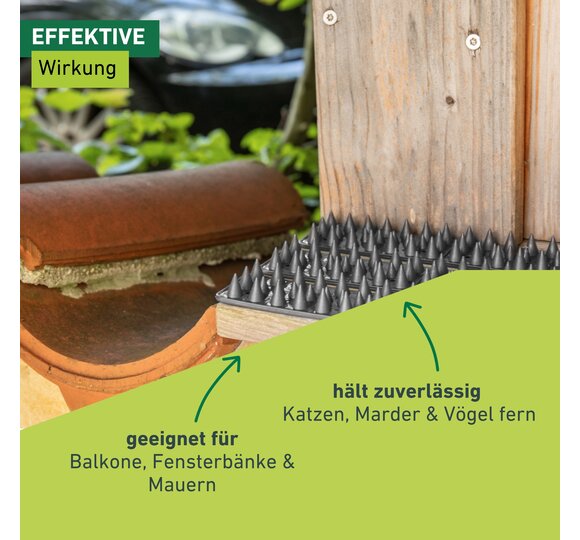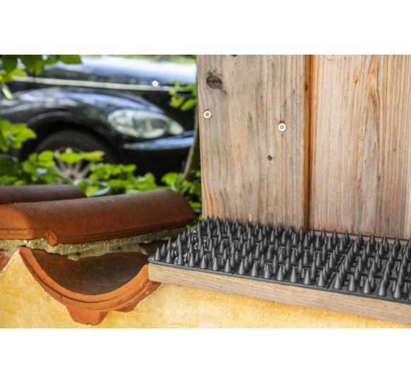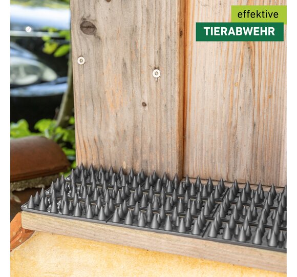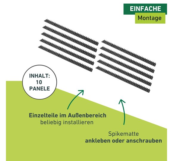 In einer Packung befinden sich zehn Paneele mit je 49 cm Länge und 4,5 cm Breite. Bei Bedarf können Sie die Länge mit einer Säge individuell kürzen. Die Spikematte kann entweder verklebt oder verschraubt werden. Danach ist die Barriere einsatzbereit und hält Vögel, Katzen und Marder von Ihrem Zuhause fern.