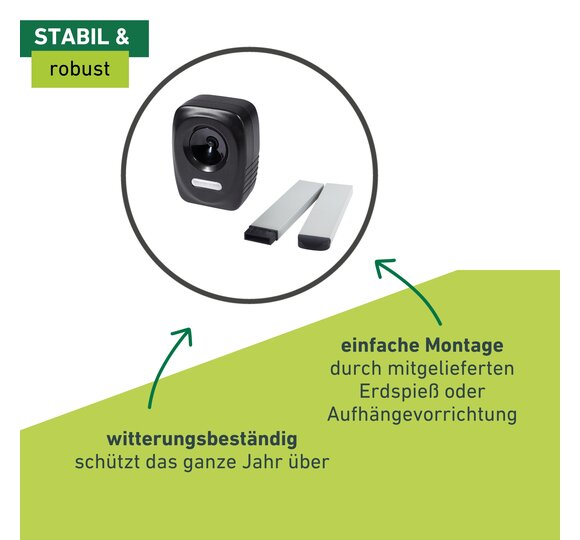 Als ersten Schritt müssen 3x AA-Batterien eingesetzt werden, diese sind nicht im Lieferumfang enthalten. Um den Tiervertreiber anschließend aufzustellen, haben Sie zwei Möglichkeiten. Sie können das Gerät entweder mit dem enthaltenen Erdspieß in den Rasen stecken oder an der Aufhängevorrichtung anbringen. Das Gerät sollte nicht verdeckt sein, denn so wird die Wirkung eingeschränkt. An der Unterseite können Sie das Gerät einschalten und einen der drei Betriebsmodi wählen. Schon macht sich der GUARD an die Arbeit und Ihr Garten ist geschützt.