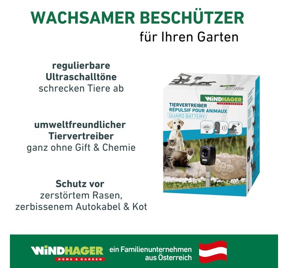 Zerstörter Rasen, zerbissene Autokabel und Tierkot auf dem Grundstück sind ärgerlich. Doch damit ist jetzt Schluss, denn der GUARD kümmert sich darum! Dieser Tiervertreiber hält ungebetene tierische Gäste aus Ihrem Garten fern – und das ganz ohne Gift und Chemie. Das batteriebetriebene Gerät sendet Ultraschalltöne aus, welche für das menschliche Ohr kaum hörbar sind. Tiere wie Hunde oder Katzen werden von ihnen jedoch in die Flucht geschlagen. Ihr empfindliches Gehör nimmt die Töne nämlich als äußerst unangenehm wahr. Das witterungsbeständige Gehäuse ermöglicht den Einsatz Tag und Nacht. So sind Sie rund um das Jahr gut geschützt vor fremden Hunden, Katzen aber auch vor Mardern, Waschbären und Wildtieren. Mit einem Wirkungsbereich von 40 m², schützt der GUARD in einem Radius von 6 m.