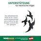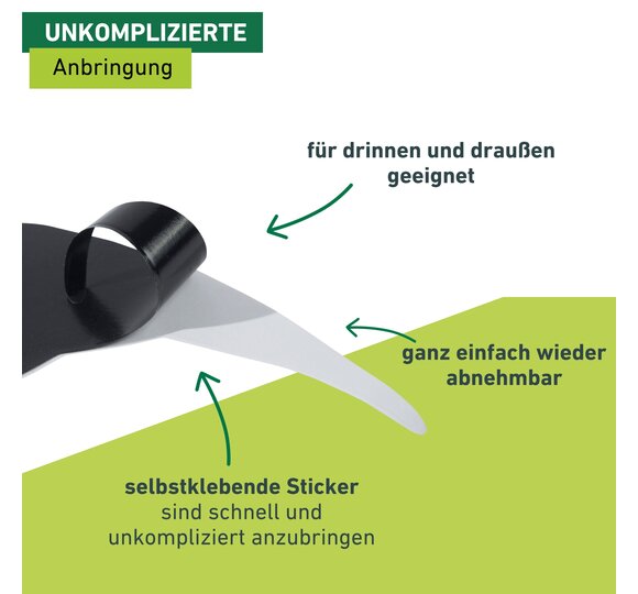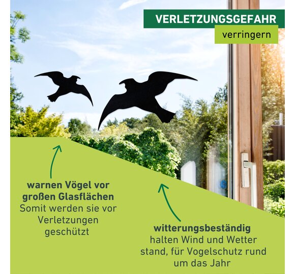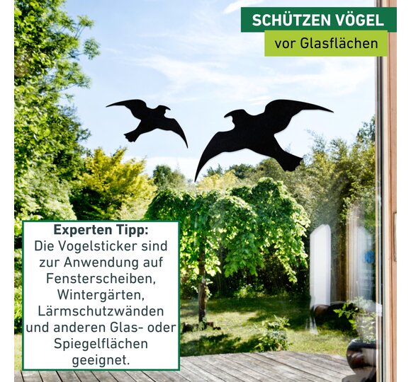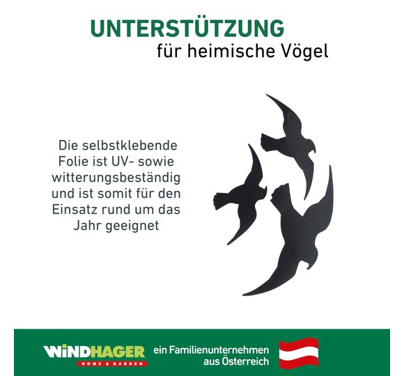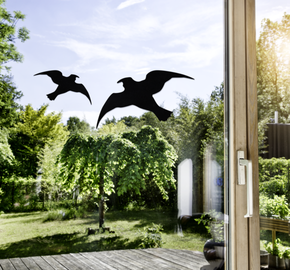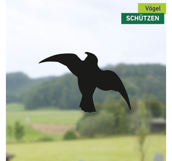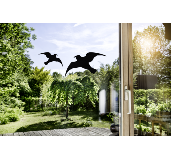 Vögel können große Glasflächen häufig nicht erkennen, vor allem wenn sie sich stark spiegeln. Der Flug gegen eine Scheibe kann schnell gefährlich für die Tiere werden. Häufig verletzen sie sich dabei, in manchen Fällen endet es auch tödlich. Um die Vögel zu schützen, sollten diese Vogel-Silhouetten auf großen und stark spiegelnden Glasflächen angebracht werden. So werden die Vögel gewarnt und die Verletzungsgefahr verringert sich. Die selbstklebende Folie ist UV- sowie witterungsbeständig und ist somit für den Einsatz rund um das Jahr geeignet.
