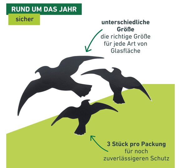 In der Packung befinden sich drei Stück Vogel-Silhouetten in unterschiedlichen Größen. Die Sticker sind selbstklebend und sofort einsatzbereit. Sie können die Folie sowohl in Innen- als auch in Außenbereichen anbringen und nach Wunsch wieder ganz einfach entfernen. Die Vogelsticker sind zur Anwendung auf Fensterscheiben, Wintergärten, Lärmschutzwänden und anderen Glas- oder Spiegelflächen geeignet.