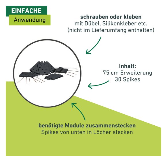 Mit dem Erweiterungsset können Sie die Taubenabwehr um bis zu 75 cm und 30 Spikes erweitern.