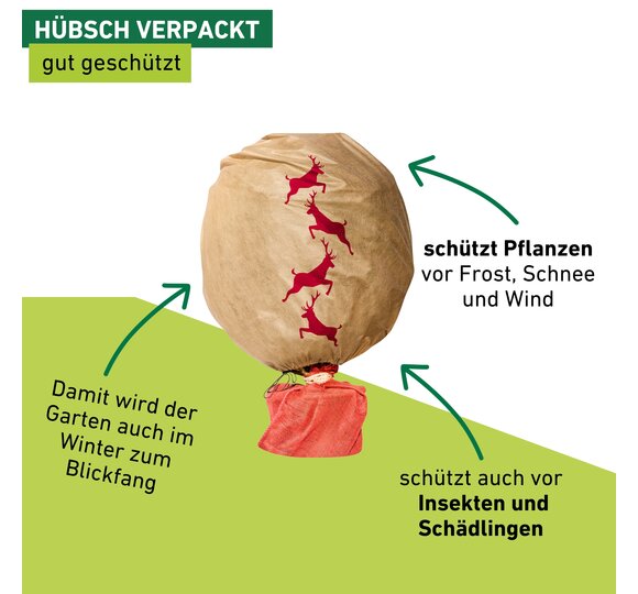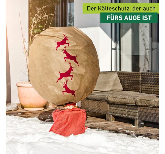 Wenn der Winter vor der Tür steht, ist es Zeit, die Pflanzen im Garten auf die kalte Jahreszeit vorzubereiten. Diese Vlieshaube hilft dabei, Ihre Sträucher, Topfpflanzen und (Jung)-Bäume vor Frost zu schützen und schafft zusätzlich einen dekorativen Hingucker im winterlichen Garten. Die Haube mit Hirschmotiv ist in drei verschiedenen Größen erhältlich, somit ist sie zum Schutz von großen und kleinen Pflanzen geeignet. Dank der integrierten Kordel lässt sich die Vlieshaube ganz einfach über die Pflanze legen und unten zuziehen. Einmal angebracht, schützt sie den ganzen Winter lang vor Frostschäden und Austrocknung durch kalten Wind. Das wasser- und luftdurchlässige Material sorgt für idealen Luftaustausch, während das Wasser im Inneren langsamer verdunstet. Zudem wurde die Vlieshaube mit einem UV-Stabilisator versetzt, welcher das Vliesmaterial länger haltbar macht.