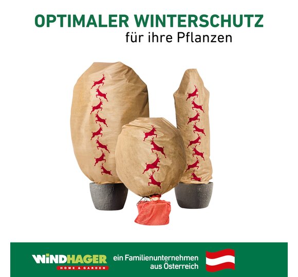 Eine Vlieshaube hilft dabei, Topfpflanzen, (Jung-)Bäume und Sträucher im Garten während der kalten Jahreszeit vor Frost und Wind zu schützen. Im späten Herbst, kurz bevor der Winter einkehrt, gilt es die Pflanzen gut einzupacken. Zweige und sperrige Pflanzen können, vor Anbringung des Winterschutzes, mit einer Schnur, wie zum Beispiel dem Kokos-Baumanbinder von Windhager, zusammengebunden werden. Die Vlieshaube wird danach einfach von oben über die Pflanze gegeben und mithilfe der Kordel unten zugezogen – schon kann der Winter kommen. Die Vlieshaube kann bis zum Frühjahr auf der Pflanze bleiben. Achten Sie darauf, dass die gesamte Pflanze bedeckt ist und keine Zweige oder Blätter mehr sichtbar sind. Bei Kübelpflanzen sollte auch der Topf geschützt werden. Das funktioniert schnell und unkompliziert mit dem Windhager-Topfschutz. Für rundum gut geschützte Pflanzen können Sie den Topf zusätzlich auf eine Topfunterlage stellen.