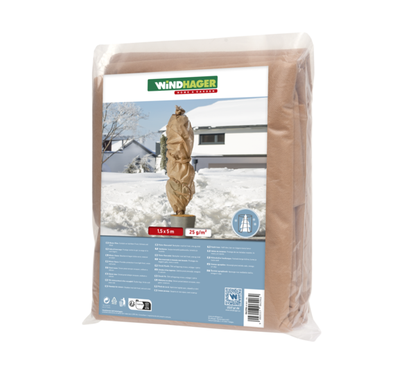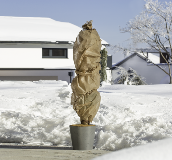 Ein Wintervlies hilft dabei, Topfpflanzen, (Jung-)Bäume und Sträucher im Garten während der kalten Jahreszeit vor Frost und Wind zu schützen. Im späten Herbst, kurz bevor der Winter einkehrt, gilt es die Pflanzen gut einzupacken. Zweige und sperrige Pflanzen können, vor dem Umwickeln mit dem Wintervlies, mit einer Schnur, wie zum Beispiel dem Kokos-Baumanbinder von Windhager, zusammengebunden werden. Danach klappt das Umwickeln mit dem Wintervlies schnell und unkompliziert. Achten Sie darauf, dass die gesamte Pflanze bedeckt ist und keine Zweige oder Blätter mehr sichtbar sind. Für optimalen Schutz sollte das Vlies mehrmals um die gesamte Pflanze gewickelt werden. Befestigen Sie das Wintervlies anschließend zum Beispiel mit einer Bindeschnur, damit die Pflanzen den ganzen Winter über zuverlässig geschützt bleiben. Passendes Bindezubehör finden Sie ebenfalls im Windhager-Sortiment. Bei Kübelpflanzen sollte auch der Topf geschützt werden. Das funktioniert schnell und unkompliziert mit dem Windhager-Topfschutz. Für rundum gut geschützte Pflanzen können Sie den Topf zusätzlich auf eine Topfunterlage stellen.