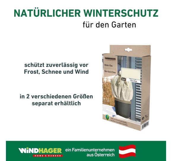 Dieses Winterschutzprodukt ist die richtige Wahl für alle Gartenfreunde, die Wert auf Nachhaltigkeit legen. Dabei bietet es die Vorteile eines klassischen Winterschutzes: es ist leicht und flexibel, passt sich gut an und schützt Ihre Pflanzen im Winter bei Kälte, Wind und Sonne. Der Winterschutz lässt sich schnell um die Pflanzen wickeln und kann anschließend mit einer Bindeschnur, wie zum Beispiel aus Jute oder Schafwolle, aus dem Windhager-Sortiment befestigt werden. Das Wintervlies hat eine Grammatur von 30 g/m2 und ist in zwei verschiedenen Größen erhältlich.