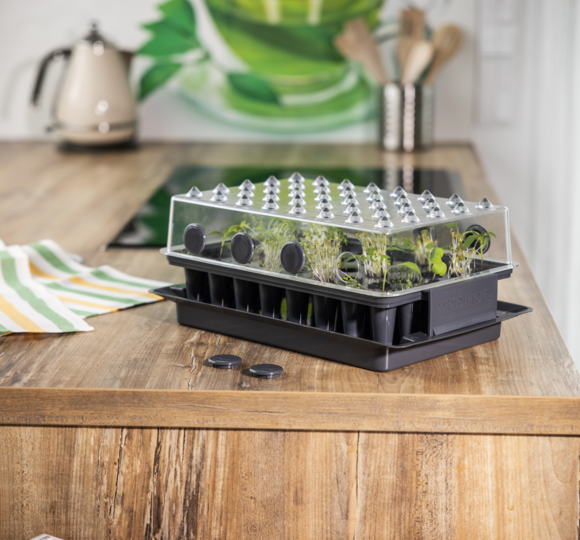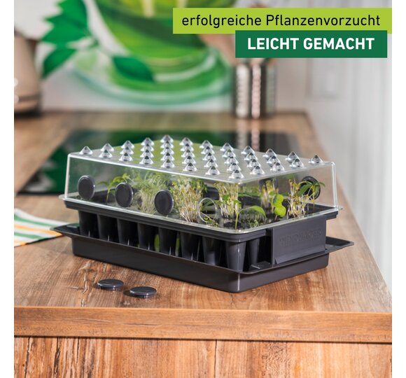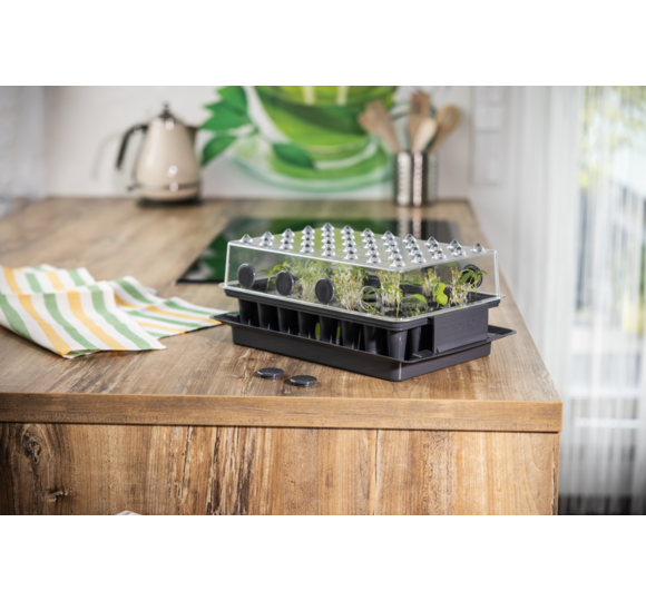 Die Haube ist mit Noppen ausgestattet, die, in die Erde auf der Saatschale gedrückt, beim Pikieren unterstützen. Zudem bieten individuell verschließbare Luftlöcher an den Seiten eine optimale Luftzirkulation beim Heranwachsen.