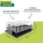 Die Saatschale dieses 3-teiligen Indoor Gewächshauses umfasst konisch geformte Pflanzlöcher, welche eine tiefe Wurzelbildung fördern. Dies führt beim Umsetzen zu weniger Stress für die Pflanzen und begünstigt ein schnelleres Anwachsen in der neuen Umgebung.