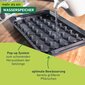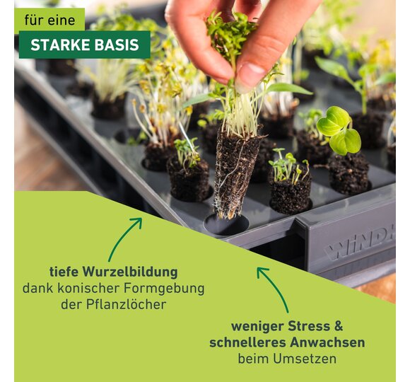 Die Bodenwanne ermöglicht eine optimale Bewässerung von bereits größeren Pflänzchen. Mithilfe des integrierten Pop-up Systems können die Pflänzchen zum Umsetzen einfach und schonend aus der Saatschale herausgelöst werden.
