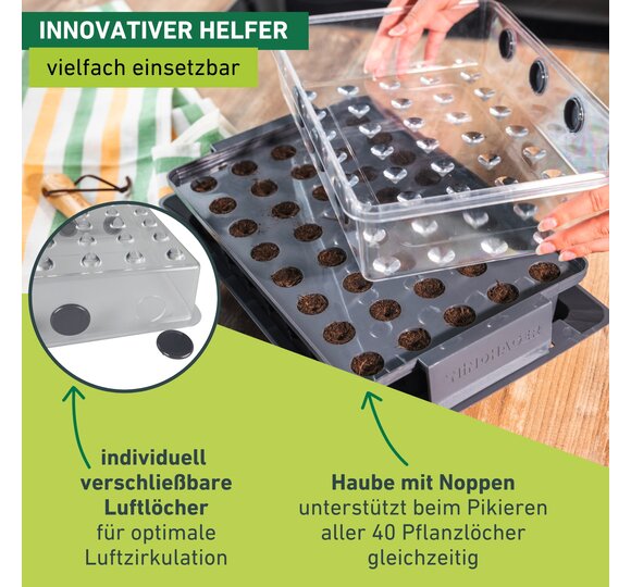 - INNOVATIVER HELFER – Die vielfach einsetzbare Haube mit Noppen dient als Abdeckung, unterstützt beim Pikieren und sorgt mit verschließbaren Luftlöchern für ideale Luftzirkulation