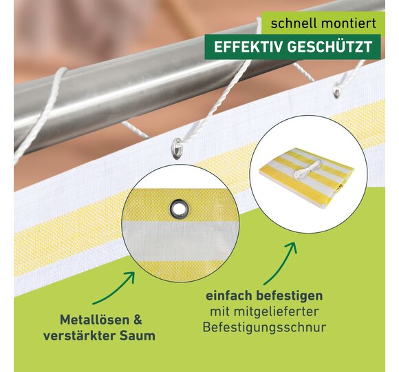 Der verstärkte Saum und die Metallösen erleichtern die Befestigung mit der Befestigungsschnur oder Universalbindern. Das Streifendesign in freundlichen Farben lässt Urlaubsstimmung aufkommen!