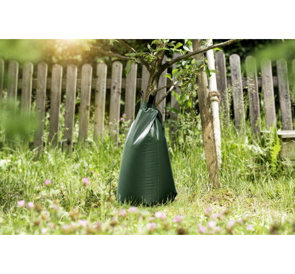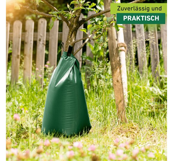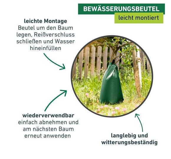 Dank der langsamen Bewässerung kann der Boden das Wasser über längere Zeit speichern – dadurch muss weniger häufig gegossen werden. Auch die Anwendung ist denkbar einfach: der Bewässerungsbeutel wird um den Stamm gelegt, mit dem Reißverschluss verschlossen und anschließend über die Füllöffnung mit Wasser befüllt. Sollte ein erweitertes Füllvolumen benötigt werden oder der Baumstamm einen größeren Durchmesser haben, lassen sich die Beutel dank des Reißverschlusses miteinander verbinden. Der besondere Clou: der Baum kann so nicht nur mit Wasser, sondern auch mit Flüssignährstoffen optimal versorgt werden.