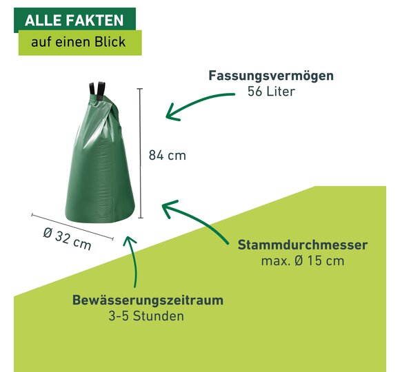 - IN 2 AUSFÜHRUNGEN ERHÄLTLICH - 56 Liter (max. Stammdurchmesser 15 cm, Bewässerungszeitraum 3 – 5 Stunden) und 95 Liter (max. Stammdurchmesser 18 cm, Bewässerungszeitraum 8 – 12 Stunden)