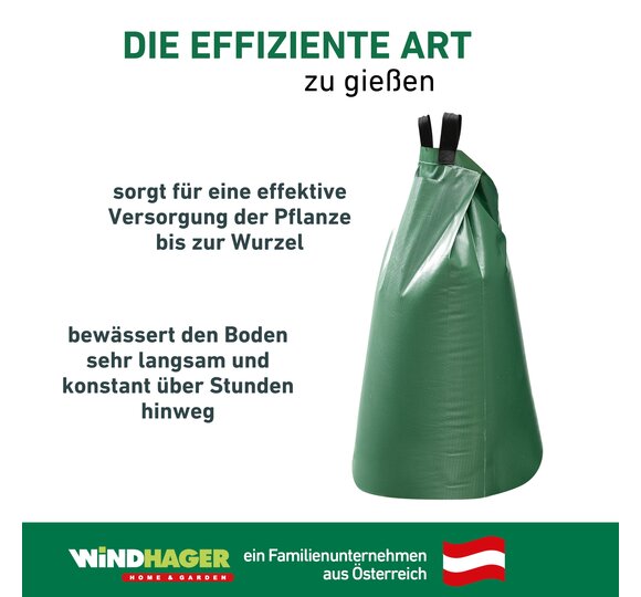 Die Bewässerung spielt eine entscheidende Rolle für die Gesundheit und das erfolgreiche Wachstum des Baumes. Insbesondere frisch gepflanzte Bäume profitieren von einer optimalen Versorgung. Wird dem Erdreich zu schnell zu viel Wasser auf einmal zugeführt, besteht die Gefahr, dass es an der Oberfläche abfließt und gar nicht erst bis zu den Wurzeln durchdringt. Die Tröpfchenbewässerung über Ablauflöcher im Beutel hingegen bewässert den Boden sehr langsam und konstant über Stunden hinweg: in der 56 Liter Variante über 3-5 Stunden, in der 95 Liter Variante 8-12 Stunden. So wird eine effektivere Versorgung der Pflanze ermöglicht.
