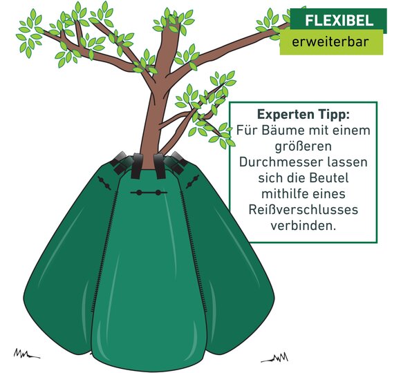 - ERWEITERBAR – Für größere Bäume oder einen erhöhten Wasserbedarf lassen sich die Säcke mittels des Reißverschlusses verbinden und so zu einem großen Sack machen
