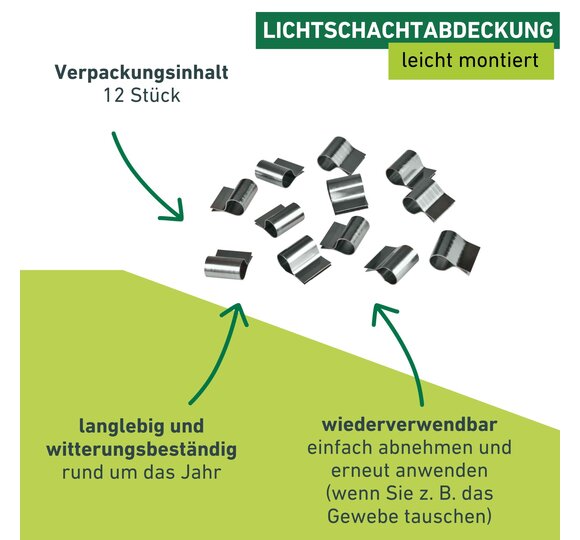 Mit diesen stabilen und witterungsbeständigen Klammern können Sie alle Gewebearten von Windhager zur Abdeckung von Lichtschächten befestigen. Das Gewebe wird mithilfe der Klammern am Lichtschachtgitter fixiert und sorgt so für Schutz vor Laub, Schmutz und Schädlingen. Die Klammern können bei Bedarf ganz einfach abgenommen und wiederverwendet werden, wenn Sie beispielsweise das Gewebe tauschen möchten.