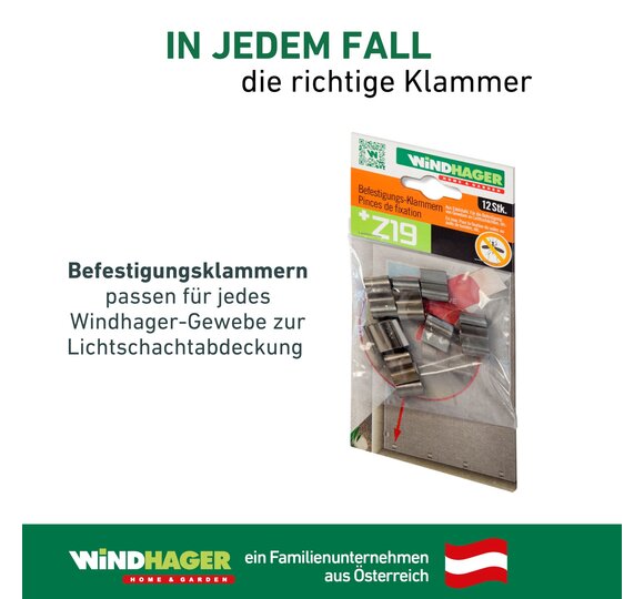 - ZUBEHÖR ZUR BEFESTIGUNG – Befestigungsklammern zur Befestigung von Windhager-Geweben zur Lichtschachtabdeckung
