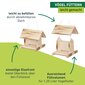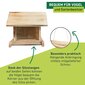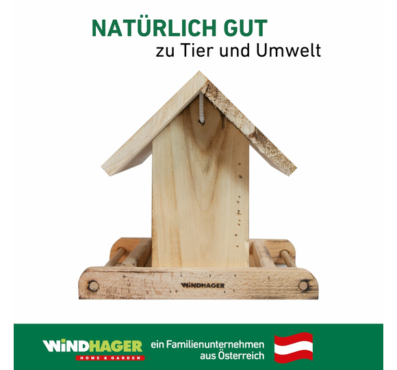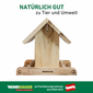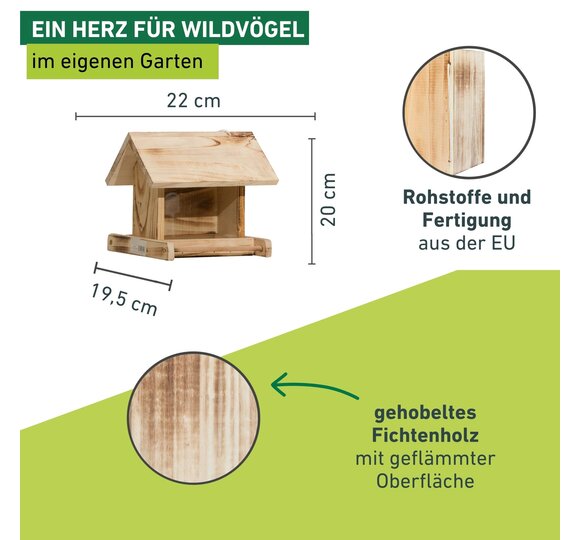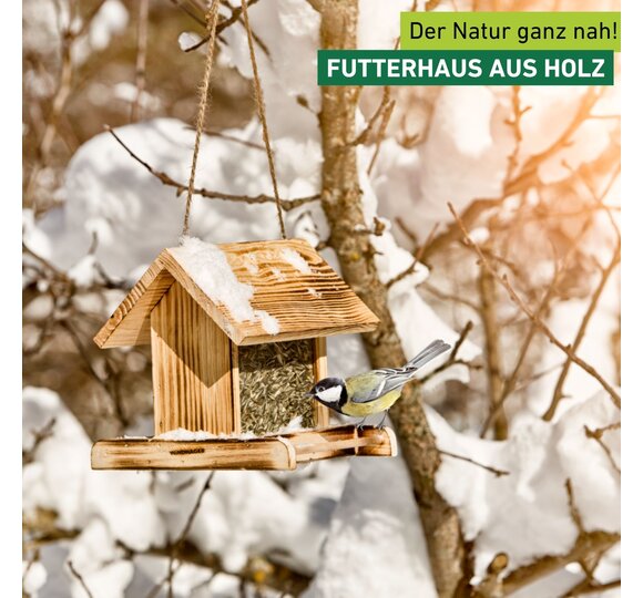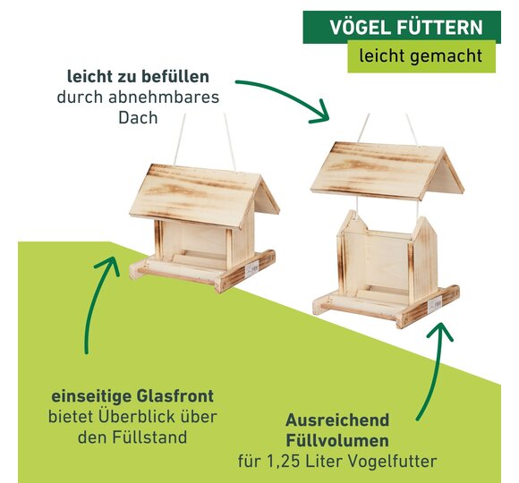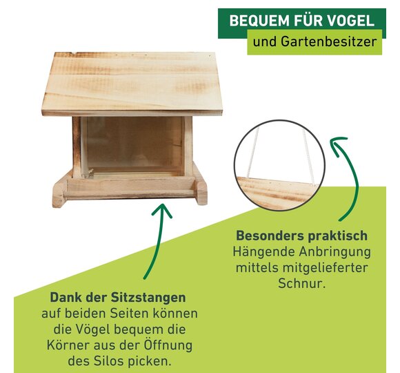 Weil es unsere heimischen Wildvögel immer schwerer auf ihrer Futtersuche haben, ist es wichtig, ihnen unter die Flügel zu greifen. Mit einer Futterstelle im Garten kann ein wichtiger Beitrag zum Erhalt der Artenvielfalt geleistet werden. Dieses Vogelfuttersilo aus geflammtem Massivholz ist hier eine gute Wahl, denn es verfügt über die idealen Eigenschaften. Das Futter kann über das aufklappbare Dach schnell und unkompliziert in das Silo gefüllt werden. Nach der Befüllung genügt ein Blick durch das große Sichtfenster, um den Futterstand direkt feststellen zu können und bei Bedarf für Nachschub zu sorgen. Die Silobauweise des Häuschens bewirkt, dass das Vogelfutter stets vor Nässe und Verschmutzung durch Vogelkot geschützt bleibt. Von der Sitzstange aus können die Vögel die Körner bequem von der unteren Öffnung am Silo picken. Auch die Anbringung erfolgt ohne viel Aufwand – das Vogelfuttersilo kann einfach an der bereits angebrachten Schnur aufgehängt werden.