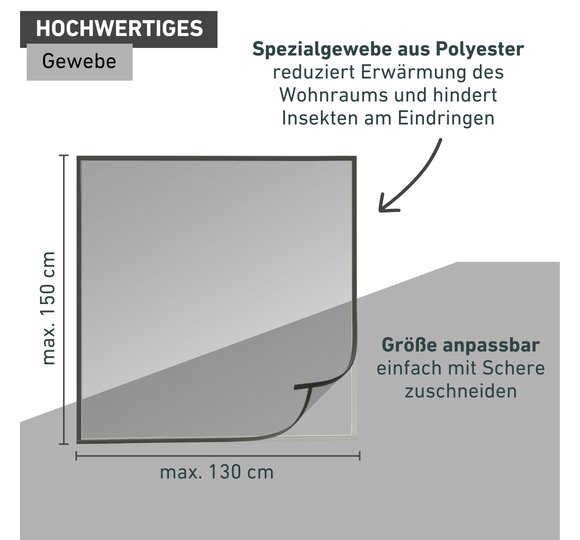 - COOL und SAFE - Hitze und Mücken bleiben auch bei geöffnetem Fenster ausgesperrt. Das Spezialgewebe aus Polyester reflektiert die Sonnenstrahlen, reduziert somit die Erwärmung des Wohnraums und hindert Insekten am Eindringen.