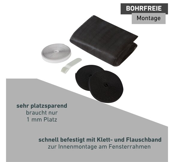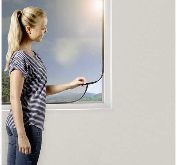 Überzeugen auch Sie sich von der simplen Innenmontage des Fliegengitters mithilfe des selbstklebenden Flausch- und Klettbandes. Individuell auf die Größe Ihres Fensters kürzbar, schützt diese preiswerte Alternative Innenräume vor lästig surrenden und stechenden Insekten. Gleichzeitig bleibt die Hitze draußen - selbst bei geöffnetem Fenster. Das speziell beschichtete Gewebe reduziert die Erwärmung des Innenraums, indem es die Sonnenstrahlen reflektiert.