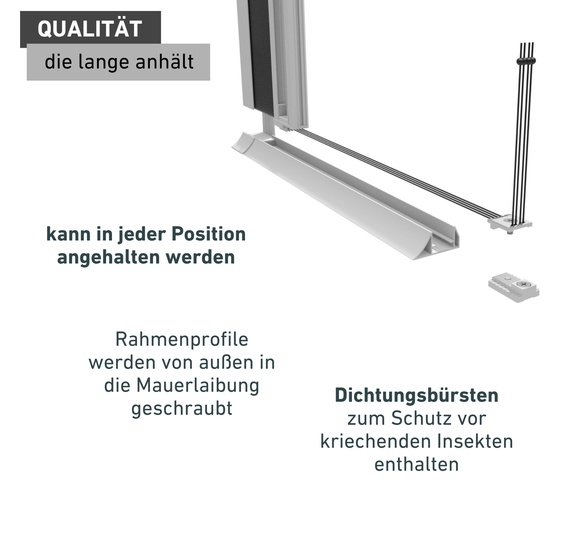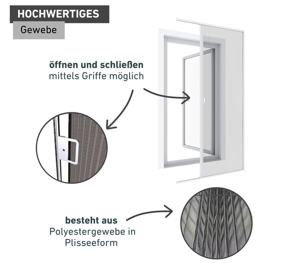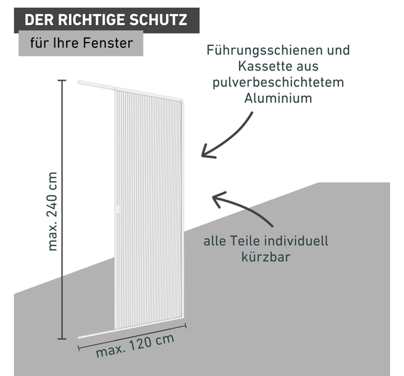 - HOCHWERTIGE KOMPONENTEN - Führungsschienen und Kassette aus pulverbeschichtetem Aluminium. Schwarzes, edles Polyester-Plissee, UV-beständig für lange Lebensdauer. Dichtungsbürsten zum Schutz vor kriechenden Insekten. Alle Teile kürzbar.