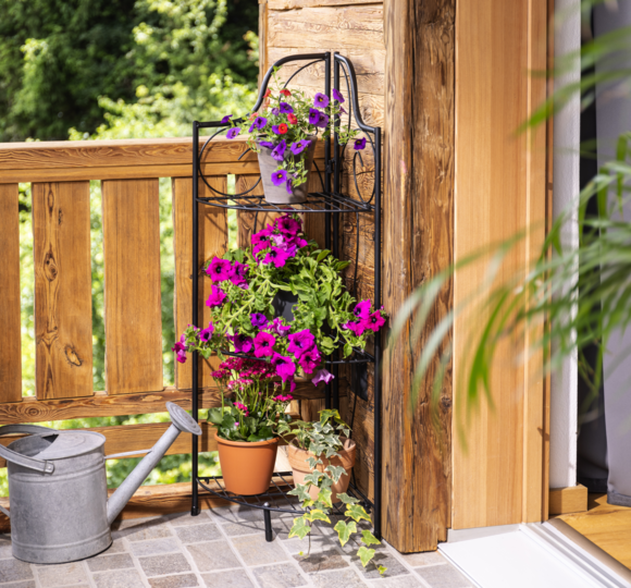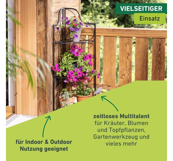 Das besonders stabile, freistehende Pflanzregal passt in jede Ecke und eignet sich für Innenräume genauso wie den Balkon, Terrasse und Garten. Kräuter, Blumen und Topfpflanzen kommen hier besonders schön zur Geltung! Aber auch Gartenwerkzeuge und ähnliches finden auf dem Pflanzregal Platz.