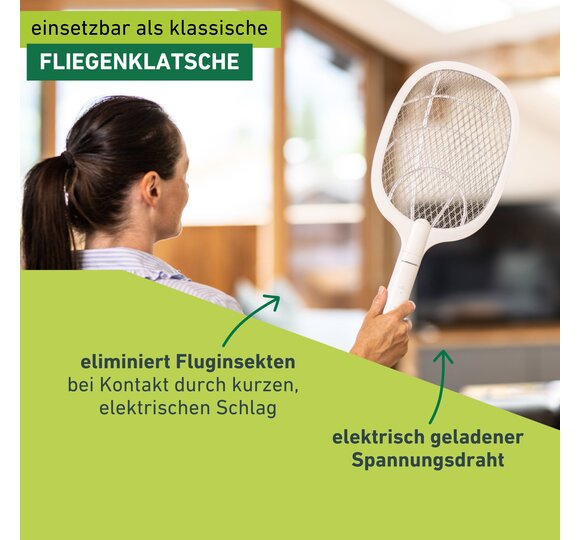 Fluginsekten wie Fliegen, Mücken, Motten und Wespen können ziemlich nervig sein, vor allem, wenn das Essen am Tisch steht. Die elektrische Fliegenklatsche 2in1 schafft hier Abhilfe: sie ist Fliegenklatsche und Lichtfalle in einem.