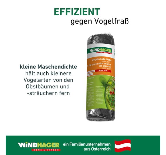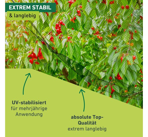 Das hochwertige Netz schützt effizient vor Vogelfraß und ermöglicht ein ungestörtes Heranreifen der Früchte. Absolute Top-Qualität, extrem widerstandsfähig und langlebig, aus reißfestem Polypropylen hergestellt. UV-stabilisiert für mehrjährige Anwendung.