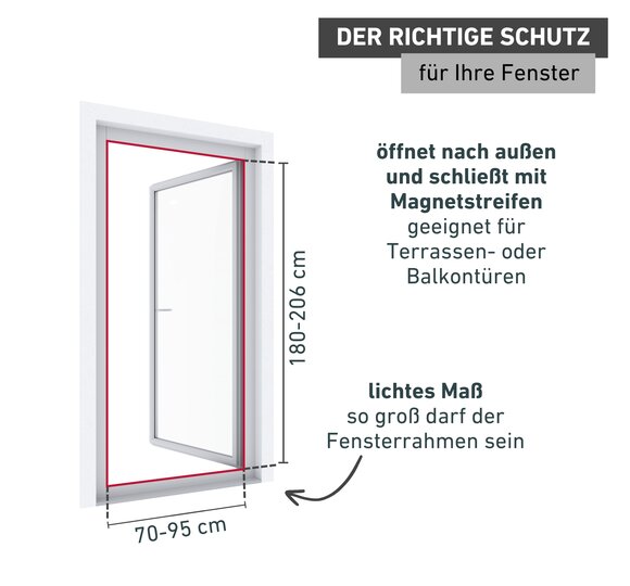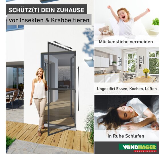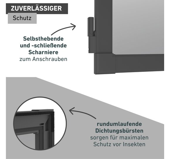 Dank dem reißfesten Gewebe aus Fiberglas und den rundumlaufenden Dichtungsbürsten finden weder fliegende noch kriechende Insekten einen Weg in Ihr Zuhause - die Sicht nach draußen bleibt dabei einwandfrei. Die faserverstärkten Scharniere schließen die Tür, während Magnetstreifen dafür sorgen, dass sie auch geschlossen bleibt.