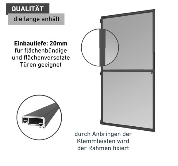 Egal ob flächenbündige oder -versetzte Tür – dieser Insektenschutz ist für beides geeignet und hat dabei eine Einbautiefe von nur 20mm.