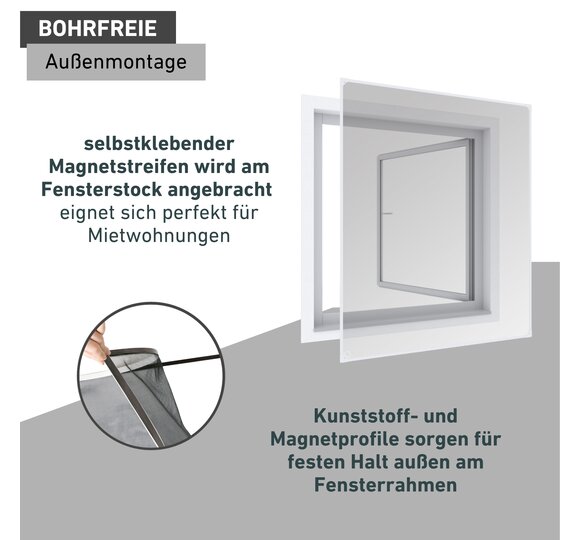 Dank der selbstklebenden Magnetstreifen, die einfach rund um den Fensterrahmen angebracht werden, lässt sich das Magnetfenster schnell und ohne Bohren von außen montieren. Der Rahmen haftet sicher an den Magnetstreifen und kann bei Bedarf ohne großen Aufwand entfernt werden.
