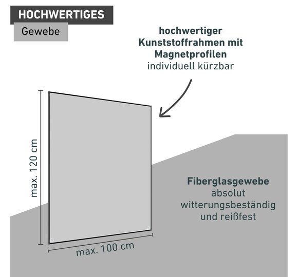 Unser Magnetfenster agiert als effektive, nahezu unsichtbare Barriere gegen Insekten, ohne den Einsatz von Pestiziden. Es bietet somit einen sicheren Schutz für Ihre Familie und Haustiere. Das Fiberglasgewebe ist nicht nur witterungsbeständig und haltbar, sondern auch dank seiner maschenfest verschweißten Struktur besonders robust. Selbst beim Zuschneiden franst das Fiberglasmaterial nicht aus.