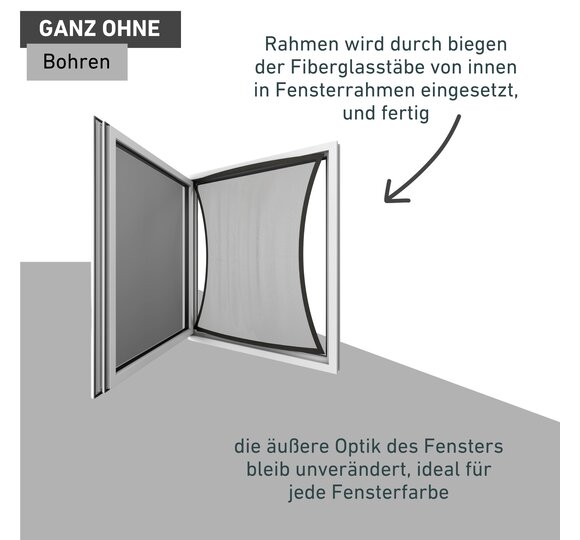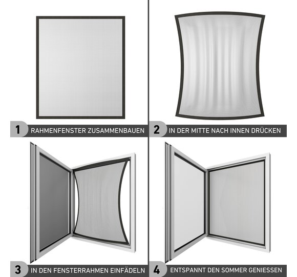- EXTREM EINFACHE INSTALLATION – Rahmen wird durch biegen der Fiberglasstäbe von innen in den Fensterrahmen eingesetzt, und fertig!