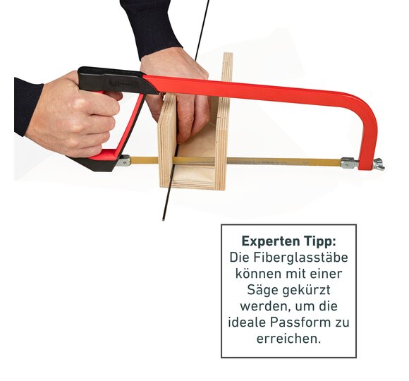 - FLEXIBLE KOMPONENTEN – biegsame Fiberglasstäbe, die mit einer Säge gekürzt werden können, verstärktes Polyestergewebe, Eckverbinder und Befestigungsband
