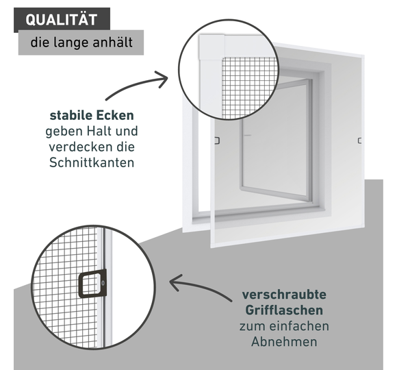 - BOHRFREIE MONTAGE - Fliegengitter wird mit Befestigungsfedern eingehängt - der Fensterrahmen bleibt intakt. Daher auch ideal für Mietwohnungen.