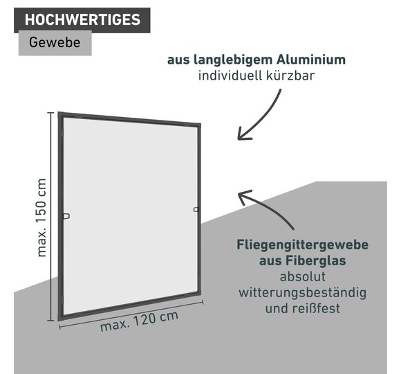 Der federleichte Alurahmen lässt sich problemlos ein- und bei Bedarf auch wieder aushängen (z. B. für Reinigungsarbeiten). Ideal auch für Mietwohnungen, weil der Fensterrahmen intakt bleibt. Die Befestigung erfolgt mittels 12 Einhängefedern, die für einen guten Halt am Fensterrahmen sorgen. Ein UV- und witterungsbeständiges Produkt mit reißfestem Premium-Fiberglasgewebe.