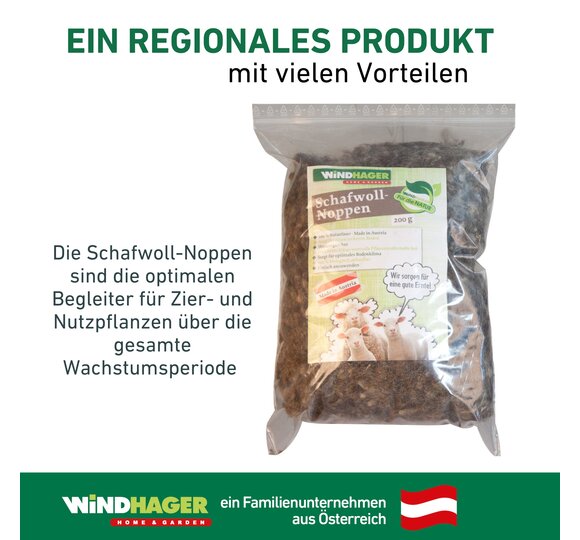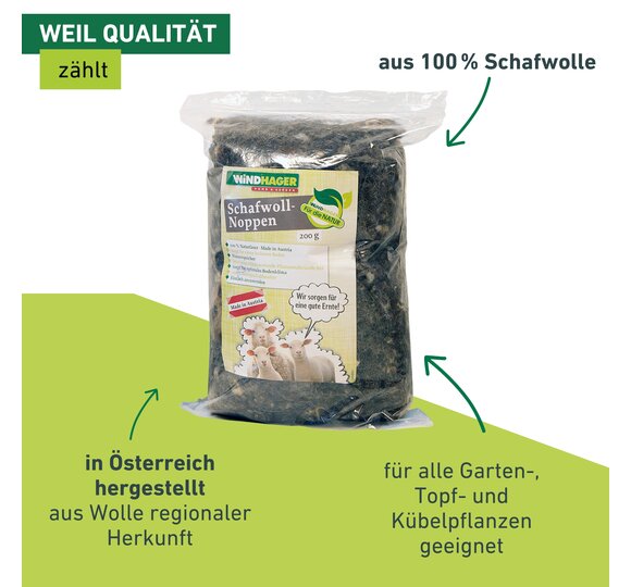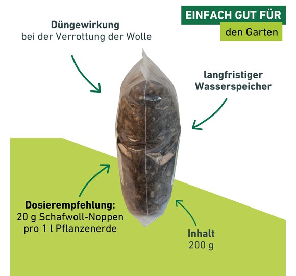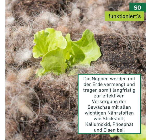 Die Schafwoll-Noppen sind die optimalen Begleiter für Zier- und Nutzpflanzen über die gesamte Wachstumsperiode. Sie werden mit der Erde vermengt und tragen somit langfristig zur effektiven Versorgung der Gewächse mit allen wichtigen Nährstoffen wie Stickstoff, Kaliumoxid, Phosphat und Eisen bei. Die Wollflocken sind auch sehr saugfähig - sie speichern Wasser und geben es langsam an die Wurzeln ab. In Österreich hergestellt  - aus Wolle regionaler Herkunft.