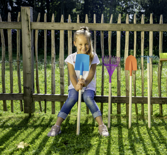 Das Sortiment der Kinder-Gartenwerkzeuge umfasst: Spitzschaufel, Gartengrubber, Gartenhäckchen, Gartenschaufel, Kinderspaten, Rechen, Fächerbesen und Besen.