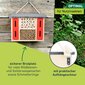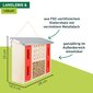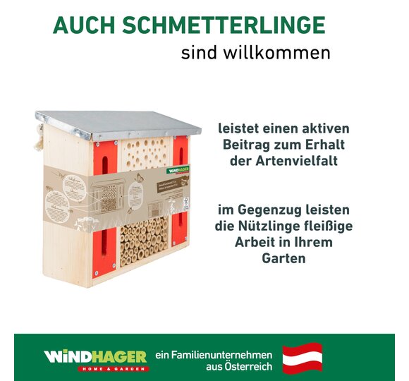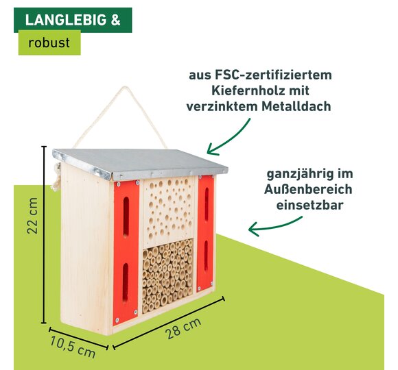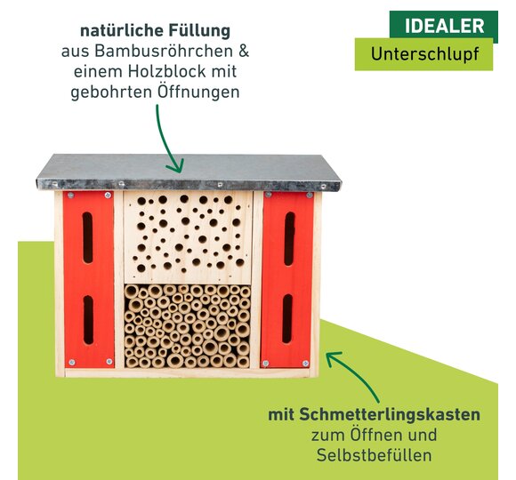 Heimische Nutzinsekten wie Wildbienen, Solitärwespen und viele mehr werden sich an dieser Unterkunft erfreuen. Das Insektenhotel Flat bietet mit artgerechter Füllung aus Bambusrohren und gebohrten Löchern in einem Holzblock einen idealen Brutplatz. Auch Schmetterlinge finden in diesem Insektenhotel ein passendes Zuhause. Der integrierte Schmetterlingskasten zum Öffnen und Selbstbefüllen lädt die bunten Gartenbesucher zum Verweilen ein. Gefertigt aus FSC-zertifiziertem Kiefernholz mit verzinktem Metalldach, kann das Insektenhotel das ganze Jahr über im Außenbereich wertvolle Dienste leisten, denn so manche Insektenarten nutzen es auch gerne als Winterquartier.