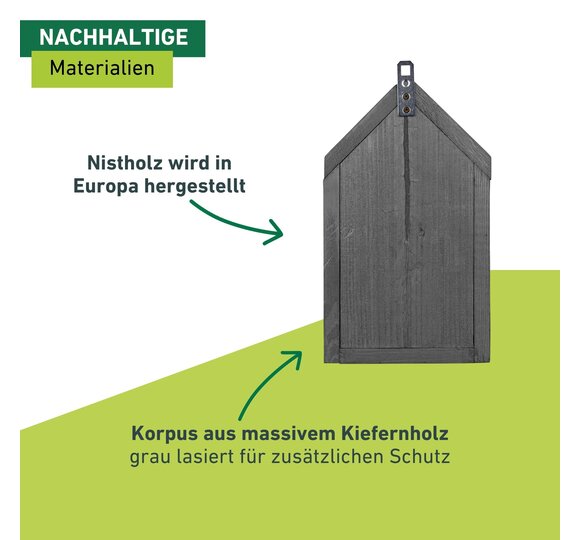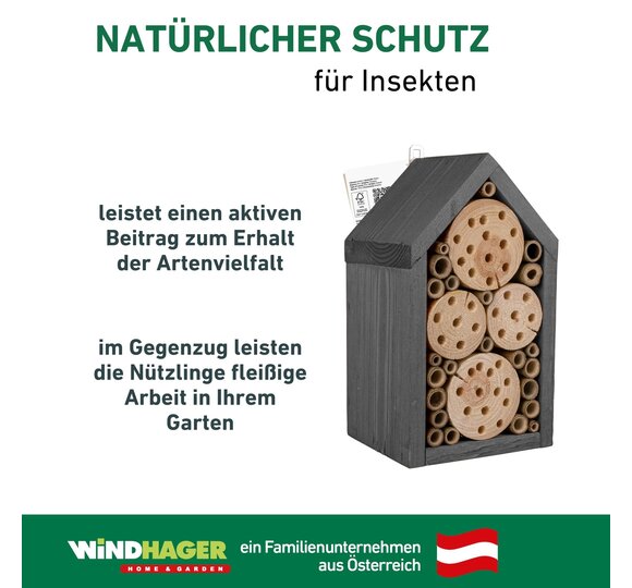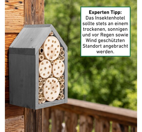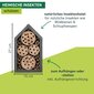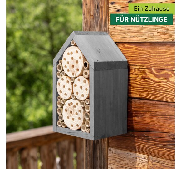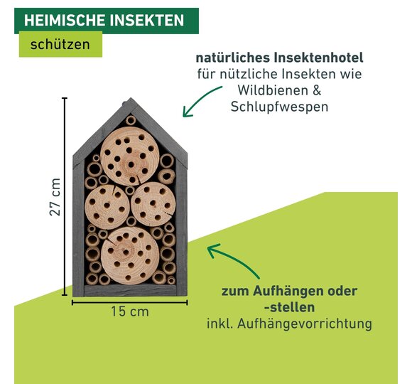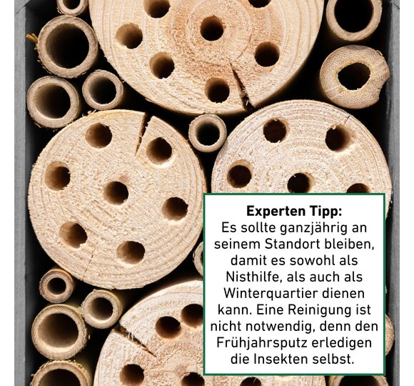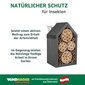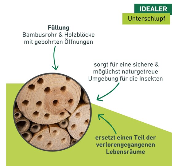 Das Insektenhotel bietet nützlichen Wildbienen und Schlupfwespen ausreichend Platz, um darin zu nisten. Zugeschnittene Holzklötze und eingeklebte Bambusrohre schaffen eine sichere und möglichst naturgetreue Umgebung für die Insekten. Das Nistholz wird in Europa hergestellt und kann einfach aufgehängt werden.